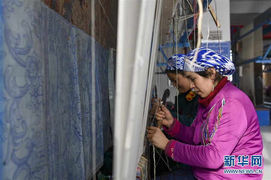 在新疆纳克西湾手工地毯开发有限公司生产车间内,工人在编织地毯(11月20日摄)。 新疆和田地区有着手工编织地毯的悠久历史,闻名中外。如今,依靠政府主导、援疆省市助力、乡村能人领头,这门传统手艺开启了当地农牧民致富增收的新途径。 新华社记者 马锴 摄