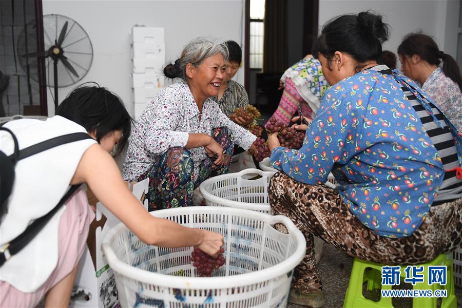 下姜村村民将刚采摘的葡萄挑拣装箱(2017年8月9日摄)。下姜村用流转的土地建成葡萄园、草莓园、茶叶园、中药材园等产业园区,村民收入实现了“节节高”。新华社记者 黄宗治 摄