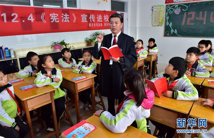 12月3日,在石家庄新乐市民生街小学,一名律师在给学生讲解宪法知识。