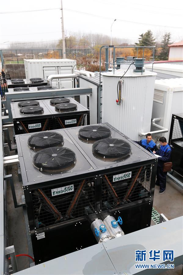 12月3日,山东省青岛市即墨区蓝村镇王演庄北村供热站工作人员在检查空气源热泵供热系统运行情况。