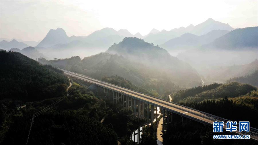 晨雾中的广西河池至百色高速公路(11月25日无人机拍摄)。新华社发 (高东风 摄)