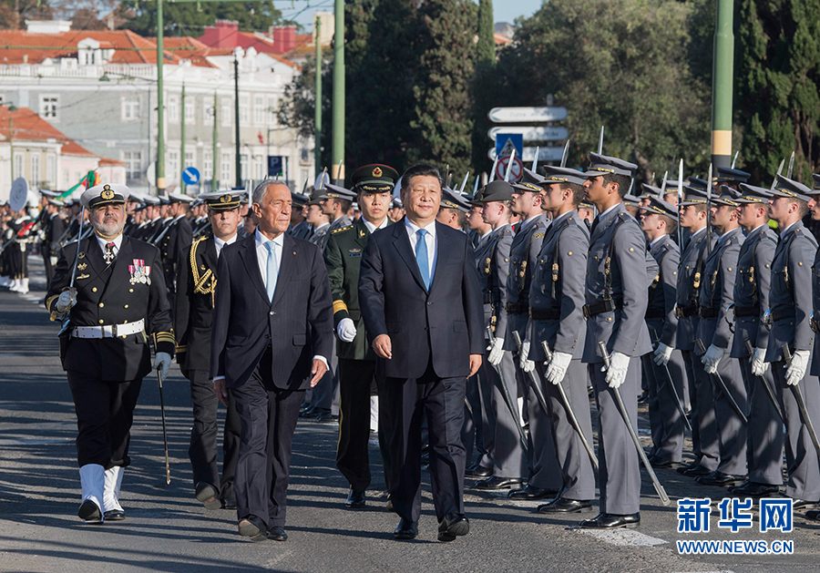 习近平和夫人彭丽媛乘车抵达帝国广场时,德索萨上前热情迎接。两国元首登上检阅台。军乐队奏中国、葡萄牙两国国歌,同时鸣21响礼炮。在德索萨陪同下,习近平检阅仪仗队,随后前往观礼台观看分列式。广场外,簇拥的人群挥舞着中国国旗,高声呼喊热烈欢迎习主席。