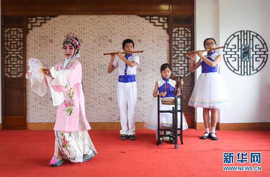 江苏省昆山市千灯镇中心小学昆曲培训班的同学在练习昆曲《游园》(2015年6月26日摄)。 新华社记者 杨磊 摄