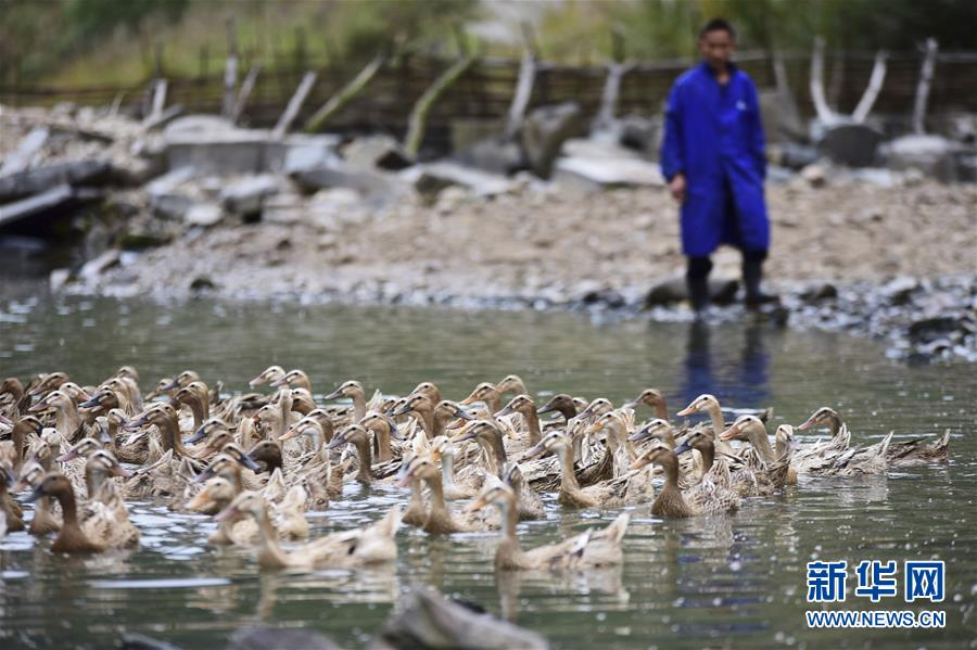 12月4日,在丹寨县雅灰乡叮咚村蛋鸭养殖基地,杨再恒在水塘里放养蛋鸭。 今年42岁的杨再恒,是贵州省黔东南苗族侗族自治州丹寨县雅灰乡叮咚村的一名蛋鸭养殖户。2015年,他通过养羊和养鱼实现脱贫,尝到了养殖产业增收的甜头。 杨再恒觉得一家脱贫不算脱贫,还要带动大家一起脱贫致富。2017年,杨再恒在当地政府的帮助下,带领6个贫困户成立了蛋鸭养殖专业合作社。目前,该合作社年产鸭蛋80多万枚。 杨再恒成为当地小有名气的“鸭司令”后,周边村寨不少村民前来参观学习。杨再恒信心满满地说:“今后还要继续学习养殖技术,研究孵化技术,扩大产业规模,和大家一起致富。” 新华社发(杨武魁 摄)