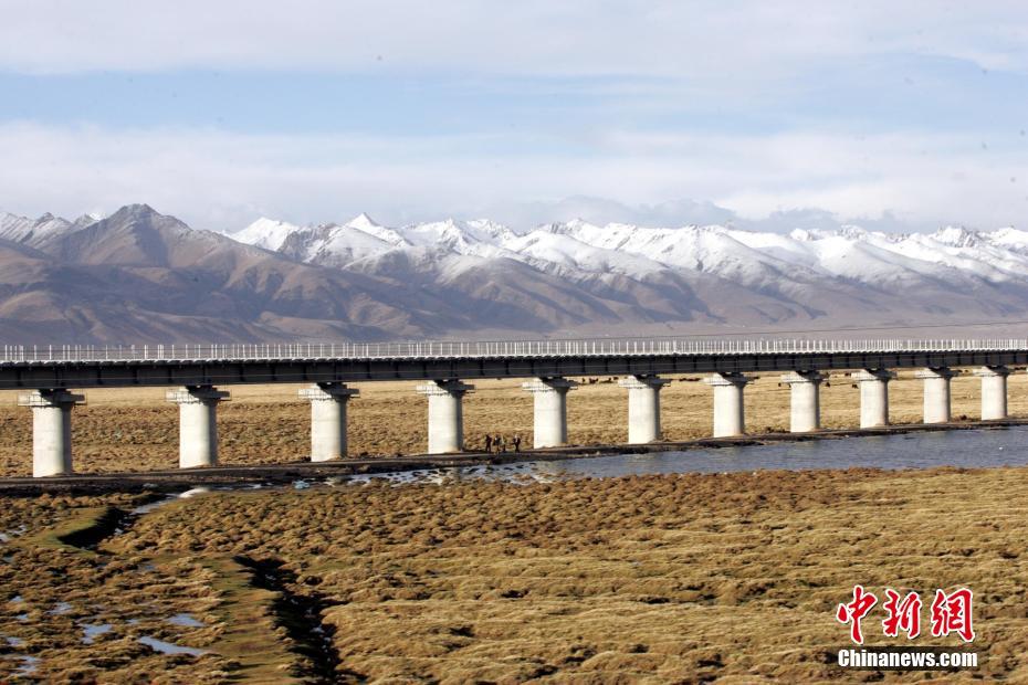 青藏铁路是重要的进藏路线,被誉为天路,是世界上海拔最高、在冻土上路程最长的高原铁路,是中国新世纪四大工程之一。图为2005年5月4日,在铺进过程中的青藏铁路。中新社记者 武仲林 摄