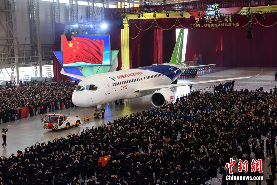 2015年11月2日,中国自主研制的C919大型客机首架机在上海浦东基地厂房正式下线,标志着该型客机已达到可进行地面试验的状态。C919大型客机是中国首款按照最新国际适航标准研制的干线民用飞机,于2008年开始研制。中新社记者 孙自法 摄