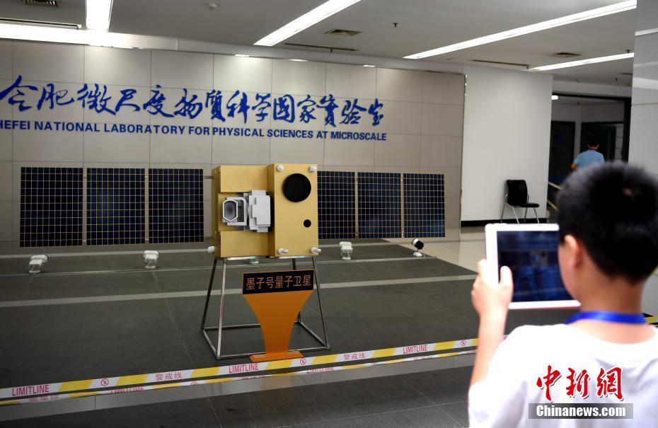 2016年8月16日,中国成功发射世界首颗量子科学实验卫星“墨子号”。2017 年6月16日,中国“墨子号”量子卫星在世界上首次实现千公里量级的量子纠缠。图为一位小朋友正在拍摄“墨子号”模型。中新社记者 韩苏原 摄