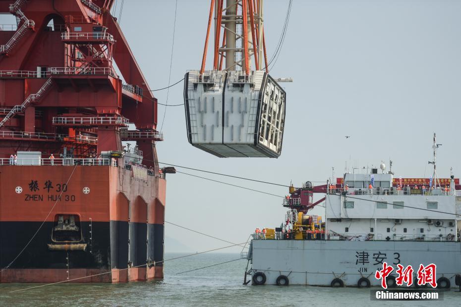 2017年5月2日,港珠澳大桥沉管隧道最终接头由起重船“振华30”吊装进入海底。“振华30”是世界上最大的起重船,由中国自主建造。中新社记者 陈骥旻 摄