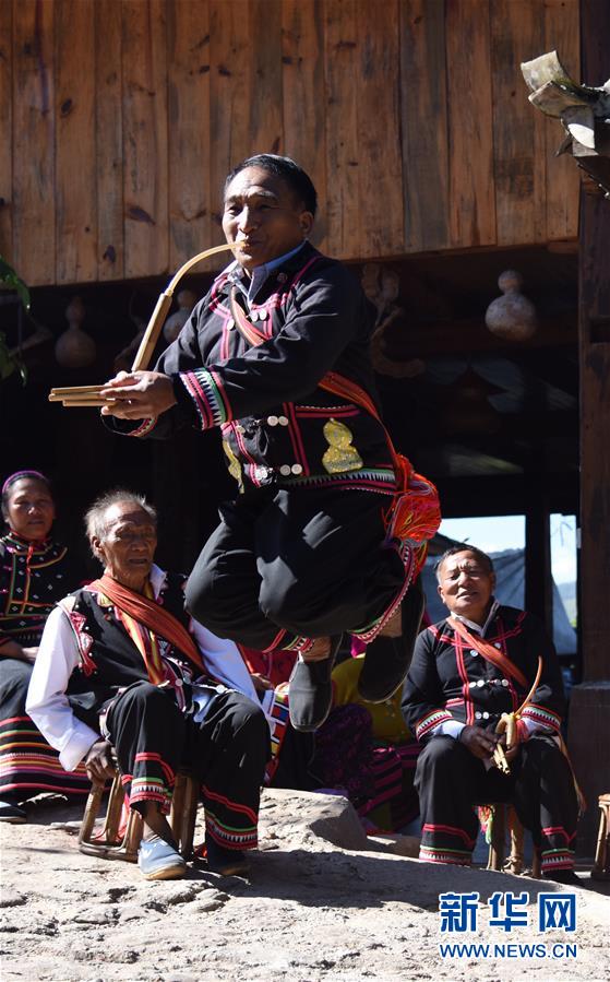 12月4日,在云南省澜沧拉祜族自治县酒井乡勐根村老达保寨,拉祜族芦笙舞传承人李石开在表演芦笙舞。 新华社记者张瑞琪摄