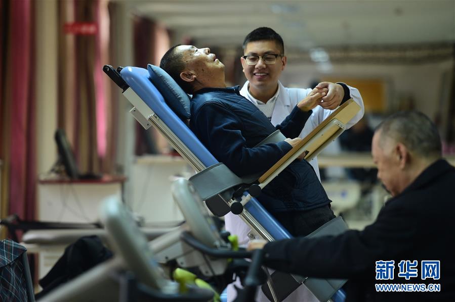 12月5日,泊头市福星园老年公寓的护理人员帮助失能老人进行康复训练。