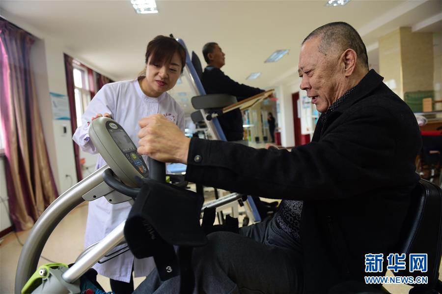 12月5日,泊头市福星园老年公寓的护理人员帮助失能老人进行康复训练。