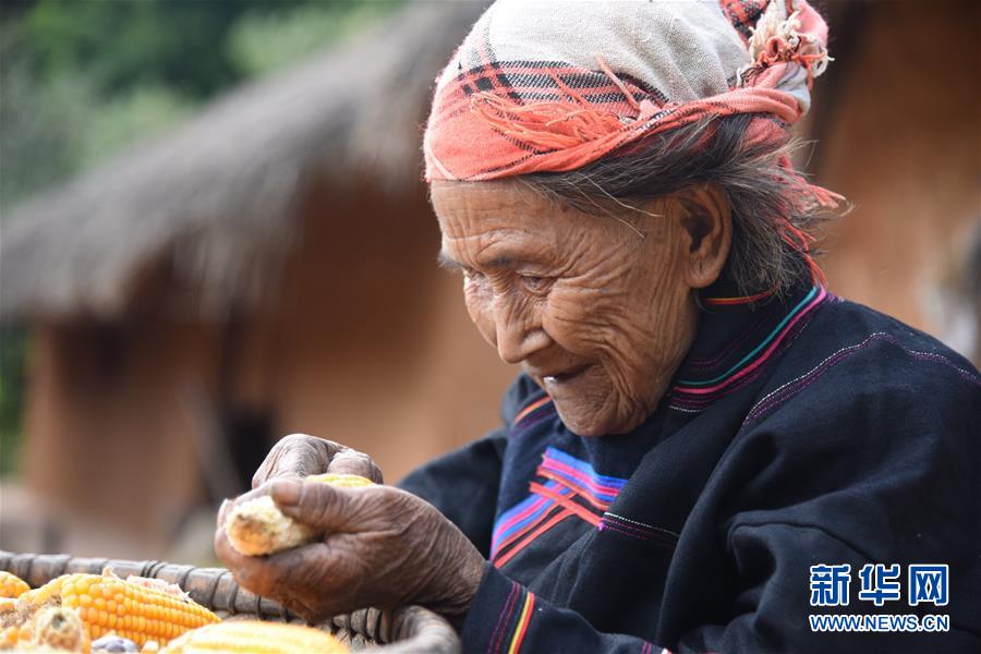 12月3日,在云南省澜沧拉祜族自治县南岭乡勐炳村龙潭老寨,81岁的李娜六老人在老宅前剥玉米。 新华社记者张瑞琪摄