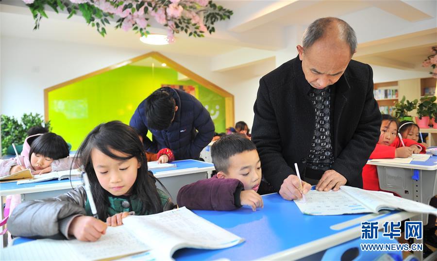 12月5日,在宣恩县高罗镇易地扶贫搬迁安置点歌乐社区的“四点半学堂”内,社区工作人员在辅导孩子们做作业。 新华社发(孟英豪 摄)