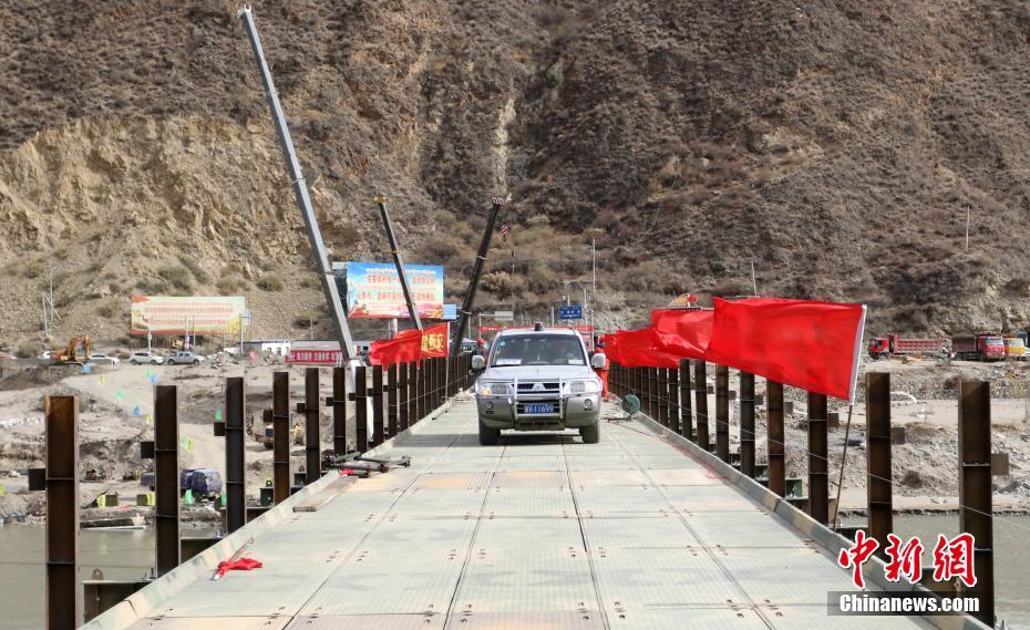 12月6日,四川巴塘,第一辆小车通过钢桥。当日,经过抢险人员13个昼夜奋战,由武警某部第三支队和四川路桥集团共同合作架设的国道318公路金沙江战备钢桥开始放行小车,随后将根据大桥试运行及连接线恢复情况,适时放行货车。中新社发 四川路桥供图