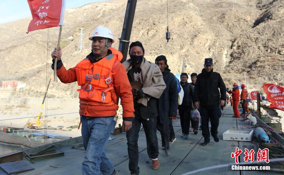12月6日,四川巴塘,抢险人员护送大桥两岸民众有序通过钢桥。当日,经过抢险人员13个昼夜奋战,由武警某部第三支队和四川路桥集团共同合作架设的国道318公路金沙江战备钢桥开始放行小车,随后将根据大桥试运行及连接线恢复情况,适时放行货车。中新社发 四川路桥供图