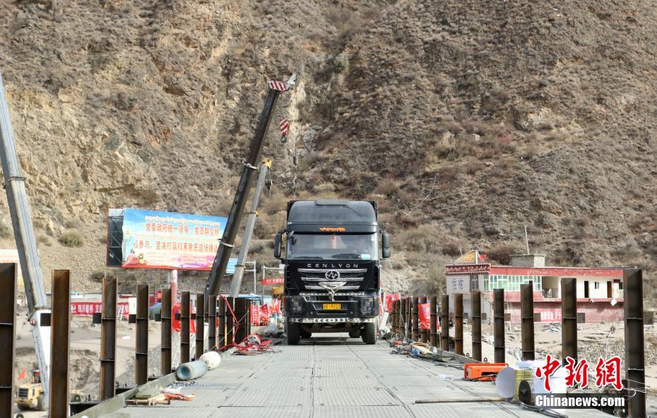 12月6日,四川巴塘,一辆40吨的货车通过钢桥进行荷载试验。当日,经过抢险人员13个昼夜奋战,由武警某部第三支队和四川路桥集团共同合作架设的国道318公路金沙江战备钢桥开始放行小车,随后将根据大桥试运行及连接线恢复情况,适时放行货车。中新社发 四川路桥供图