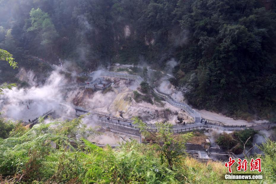 12月6日,探访中国三大地热区之一的云南腾冲,在青山环抱中的地热温泉胜地热海,热蒸气烟雾缭绕,景致宛如仙境。热海位于腾冲城南10.5公里处,总面积8平方公里,其地热显示特征为喷气孔、冒气地面、热沸泉、喷泉、热水泉、热水喷爆和毒气孔7种景观,热门地热景点包括大滚锅、热龙抱珠、鼓鸣泉、珍珠泉、眼镜泉、怀胎井等。中新社记者 孙自法 摄