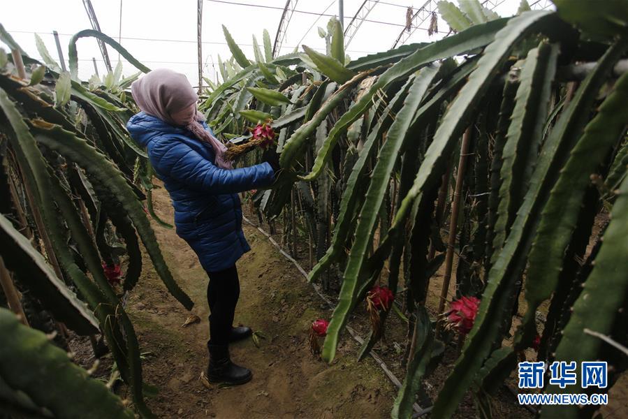 12月5日,甘肃省武威市民勤县陶中现代农业示范园区工作人员在大棚里察看火龙果长势。大雪节气将至,各地的农民们在大棚里辛勤劳作。新华社发(姜爱平 摄)