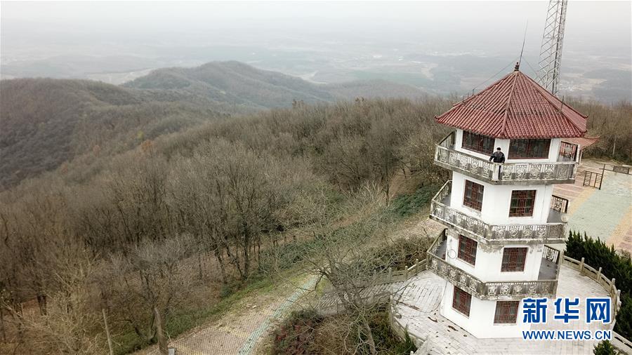 12月5日,在滁州市皇甫山国有林场,高青旺登上防火瞭望塔(无人机拍摄)。退休前,高青旺是防火瞭望员,每天都要在瞭望塔上观测林区是否有火情。 新华社记者 张端 摄