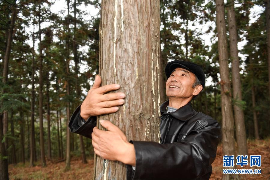 12月5日,在滁州市皇甫山国有林场,高青旺抱着一棵自己30多年前栽种的树木。 新华社记者 张端 摄