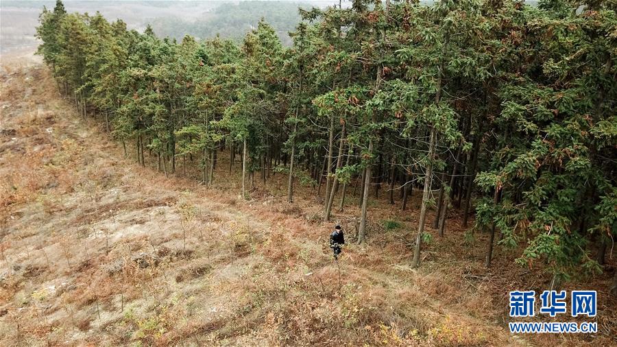 12月5日,在滁州市皇甫山国有林场,高青旺走过自己参与栽种的树林(无人机拍摄)。 新华社记者 张端 摄