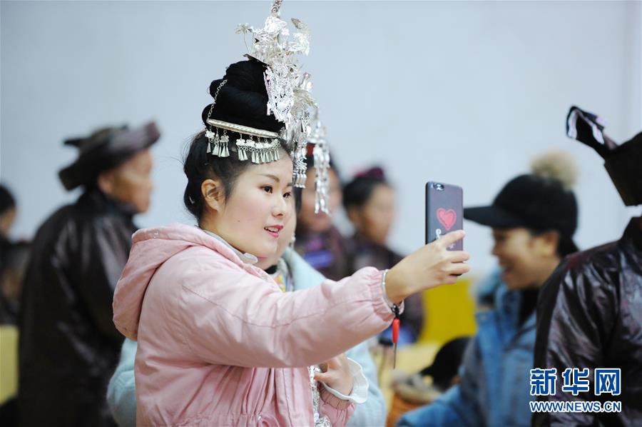 12月8日,在贵州省黎平县,参加侗族大歌比赛的选手在自拍。新华社发(杨文斌 摄)