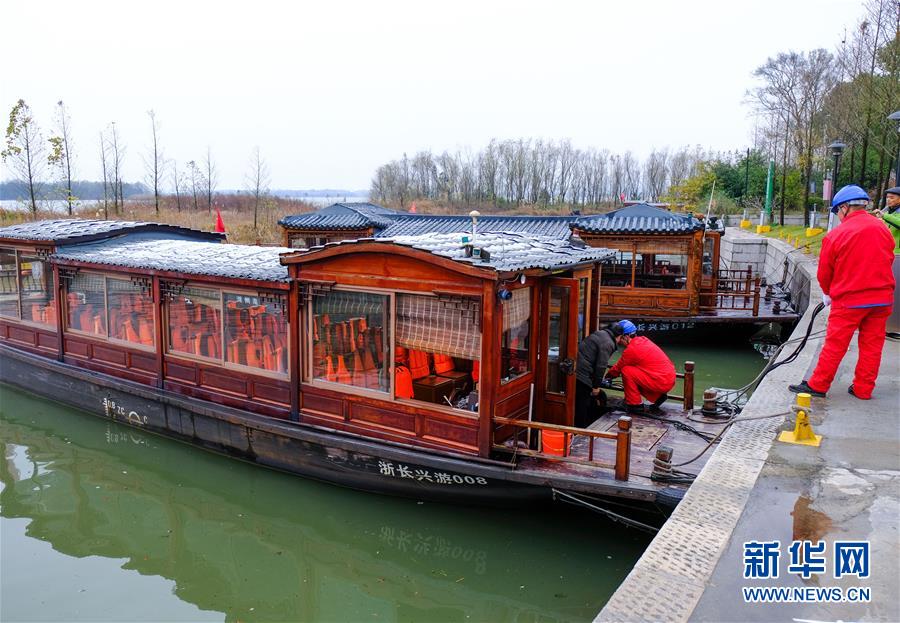 12月8日,工作人员在仙山湖景区内为电动游船充电。 截至12月初,浙江省长兴县仙山湖旅游风景区已完成包括景区电动汽车充电桩、电动游船、民宿电暖、全电厨房等多个方面的全电化改造,成为“零排放、无污染、无噪声”的绿色零排放景区,在发展旅游产业的同时也保护了当地的自然环境。 新华社记者 徐昱 摄