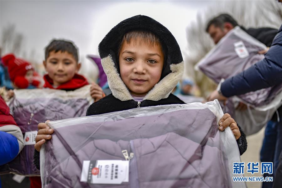 在苏鲁克村小学内,一位同学领到新的羽绒服(12月6日摄)。新华社记者 赵戈 摄