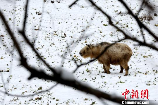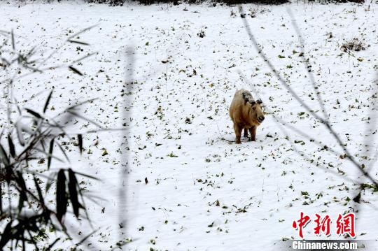 大雪中西成高铁新场街车站附近觅食的羚牛。 郝黎俊 摄