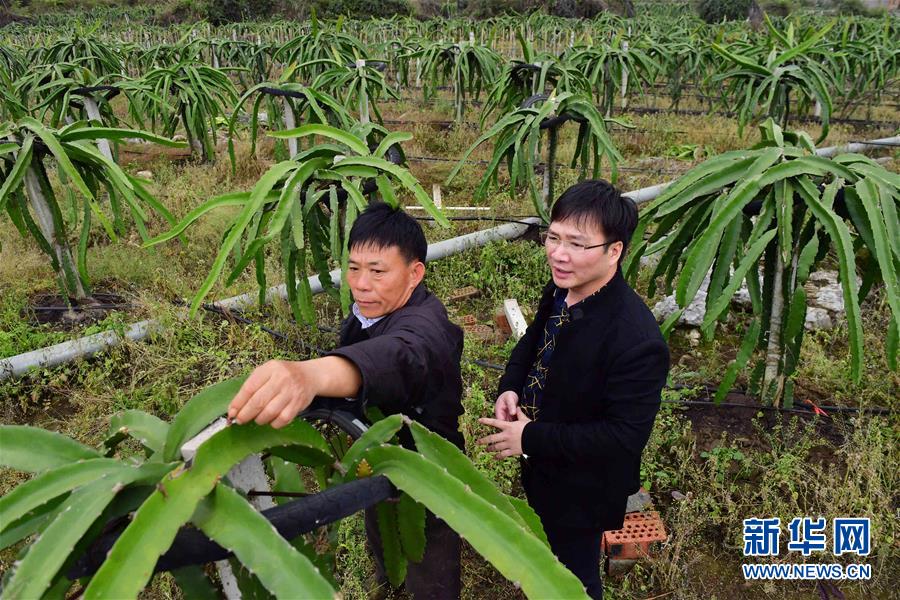 在广西百色市田东县思林镇真良村,80后青年党员梁青松(右)和60后的“脱贫户”梁日础在火龙果基地查看火龙果的长势(2017年3月11日摄)。 新华社记者 黄孝邦 摄