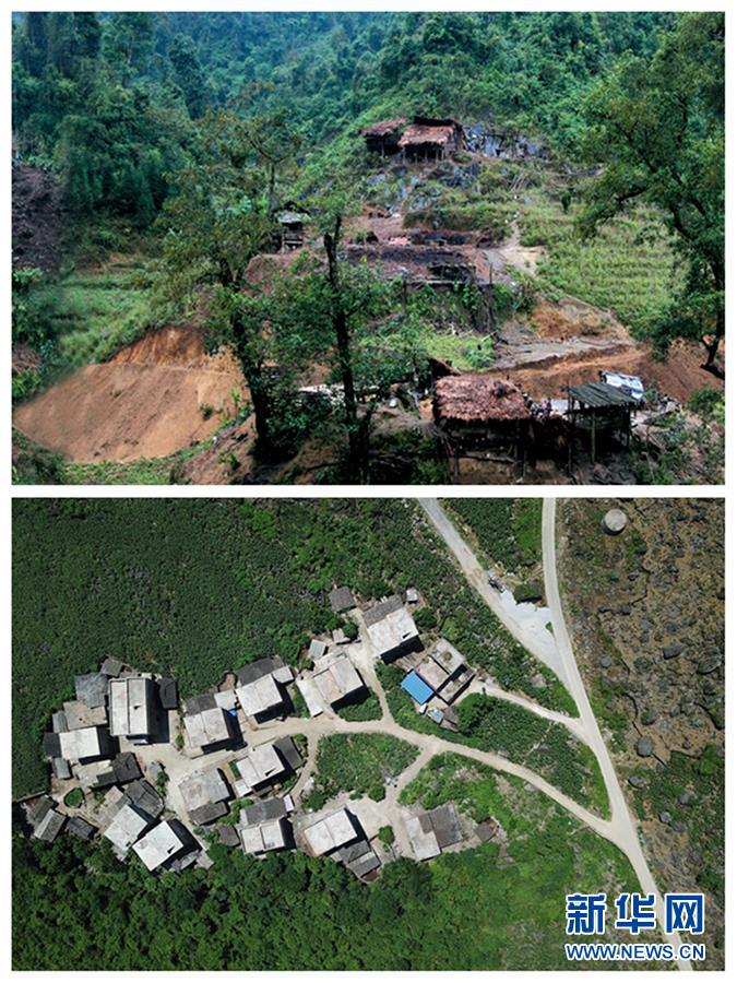 拼图照片:上图是十年前那坡县边境零公里线上甲柳村上保屯苗族群众的茅草房(2008年11月4日摄)。下图是无人机拍摄的那坡县边境零公里线上甲柳村上保屯苗族群众的楼房(2018年6月7日摄)。 新华社记者张爱林摄