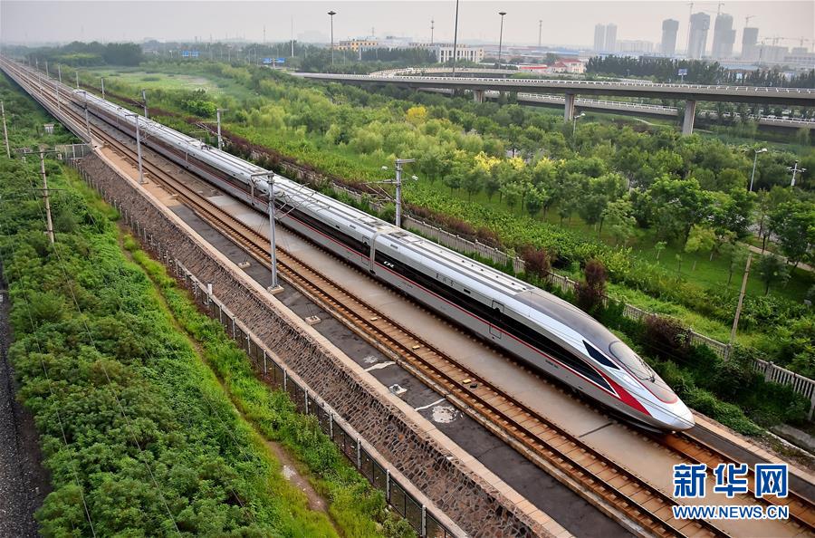 从北京南开往天津的C2001次“复兴号”中国标准动车组驶入天津市区(2017年8月21日摄)。新华社发(杨宝森 摄)