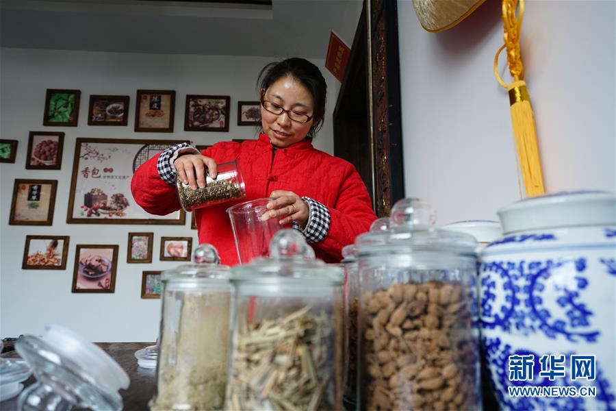 12月8日,在马庄村香包文化大院,一位村民在配制中药材,用来制作中药香包。 近年来,江苏徐州贾汪区潘安湖街道马庄村积极推进香包产业发展,带领群众增收致富。2018年,占地2000余平方米的香包文化大院投入使用。香包文化大院集香包研发、制作、销售等功能于一体,带动周边300余名村民就业,村民通过“小香包”得到“大实惠”。 新华社记者 季春鹏 摄
