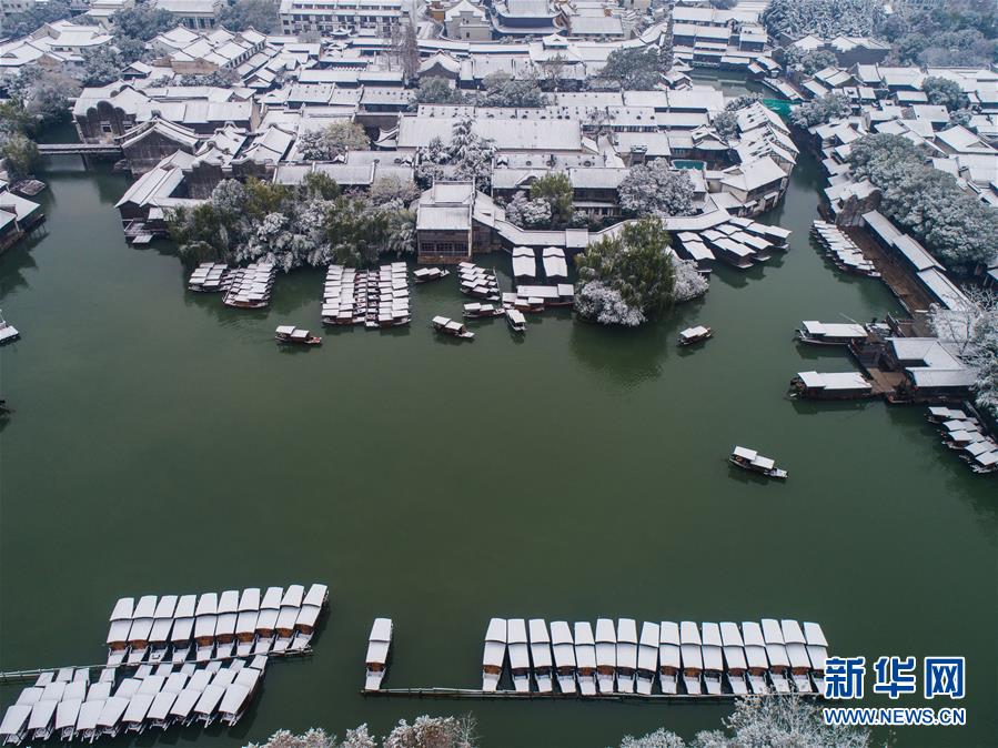 12月9日,空中俯瞰被白雪覆盖的乌镇景区(无人机拍摄)。 受冷空气影响,浙江省桐乡市迎来大范围降雪,千年古镇乌镇被厚厚的白雪覆盖。小桥流水、白墙黑瓦的江南水乡古镇,呈现出冬日雪乡的独特韵味,吸引各地游客前来观赏。 新华社记者 徐昱 摄