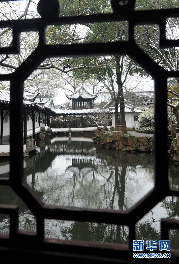 这是12月9日在苏州拙政园内拍摄的雪景。 近日,江苏苏州迎来降雪,雪后的苏州山塘古街银装素裹,景色宜人,美不胜收。 新华社发(杭兴微 摄)