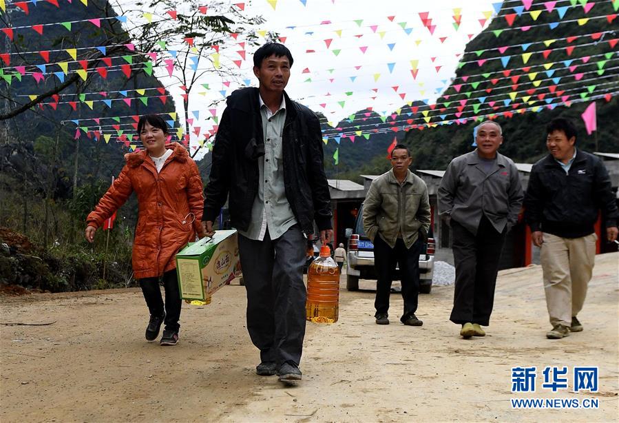 广西大化瑶族自治县共和乡农民带着生活物资准备入住弄亮村朝排移民安置点(2017年1月19日摄)。 (配本社同题文字稿) 新华社记者张爱林摄
