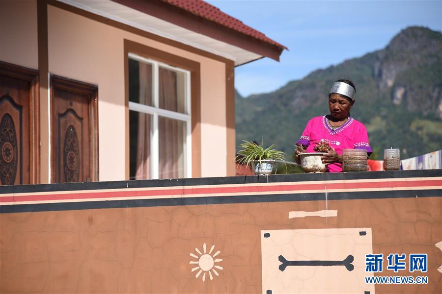 12月6日,在云南省西盟佤族自治县勐梭镇秧洛村,一名村民在阳台上打理盆栽。 新华社记者张瑞琪摄