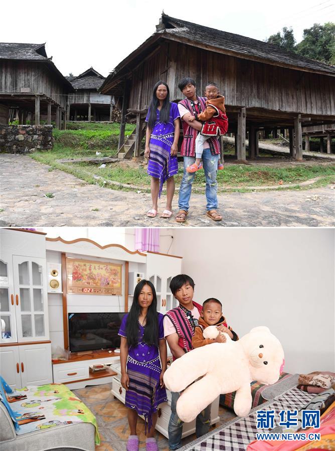 12月7日,云南省西盟佤族自治县勐梭镇班母村第十村民小组村民娜英一家在老寨前(上图)和新房中(下图)合影。 新华社记者杜涓涓摄