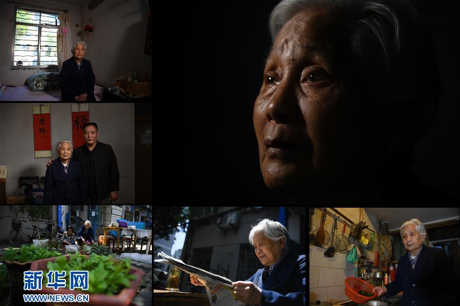 右上:伍秀英肖像;左上:伍秀英在南京家中;左中:伍秀英与二儿子罗嗣俊(右)在家中合影;左下:伍秀英(右)在种养绿植;下中:伍秀英在楼下喝茶看报;下右:伍秀英在自家厨房忙碌(拼版照片,2018年5月9日摄)。