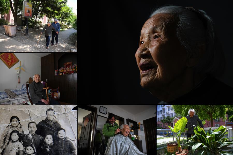 右上:黄刘氏肖像;左上:黄刘氏在儿子黄才荣的搀扶下在小区散步;左中:黄刘氏在南京家中;左下:黄刘氏(后排右)、黄刘氏母亲(后中)、黄刘氏儿子黄才荣(前排右二)的老照片(翻拍照片);下中:护工给黄刘氏梳理头发;下右:黄刘氏在小区里侍弄花草(拼版照片,2018年4月19日摄)。