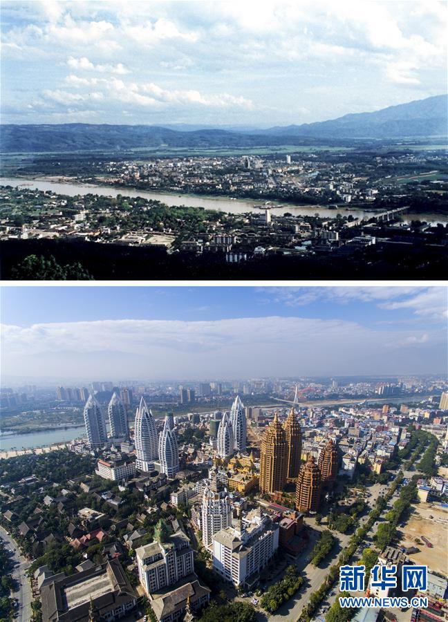 拼版照片:上图为上世纪八十年代的景洪城全貌(资料照片);下图为澜沧江两岸的景洪城一角(11月30日新华社记者江文耀使用无人机拍摄)。