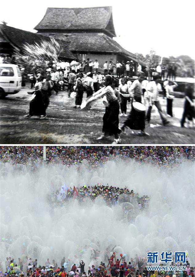 拼版照片:上图为1979年的泼水节(资料照片);下图为游客在云南景洪市泼水广场上泼水狂欢(2017年4月15日新华社记者胡超摄)。 新华社发