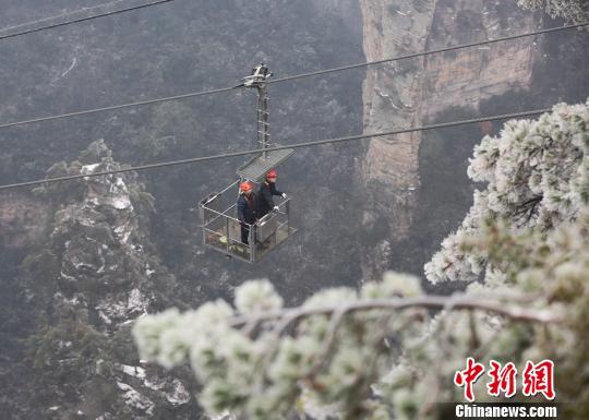 黄石寨索道检修工在冰雪天气对索道进行巡检。 吴勇兵 摄