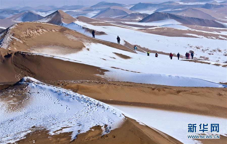 12月9日,游客在巴丹吉林沙漠边缘观赏雪后沙漠美景。