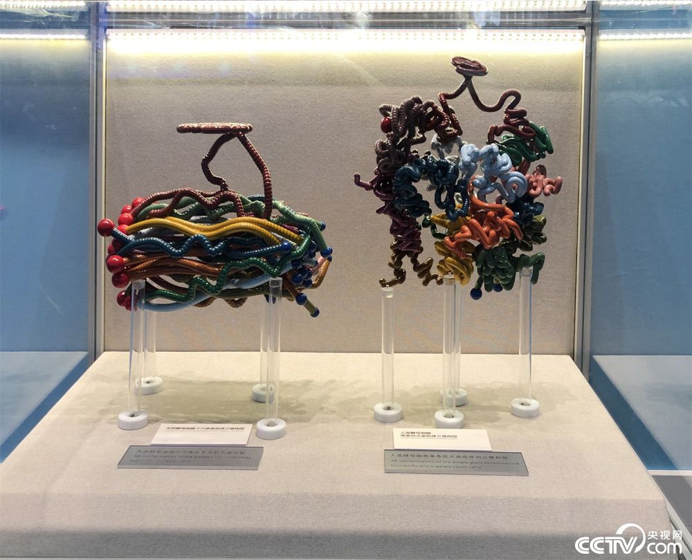 (左)天然酵母细胞十六条染色体三维构型 (右)人造酵母细胞单条巨大染色体三维构型。
