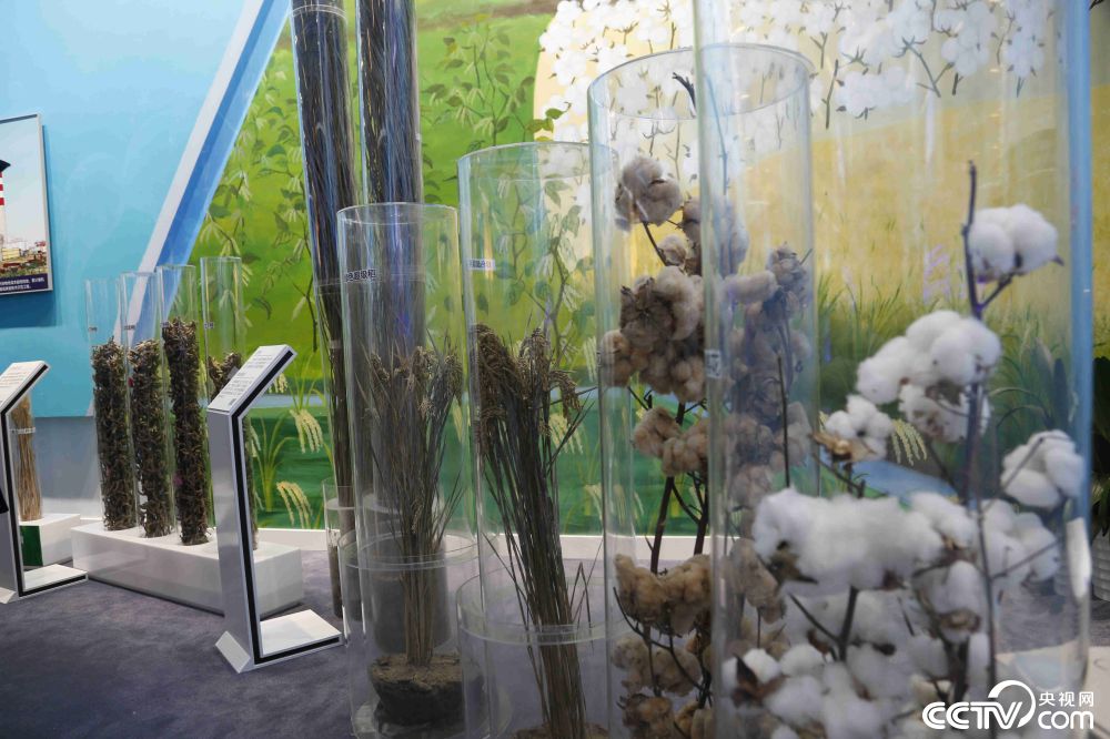 农作物新品种研究成果展示。从右至左依次为:新疆棉花、巨型稻、绿色超级稻、东生系列大豆、小偃麦。