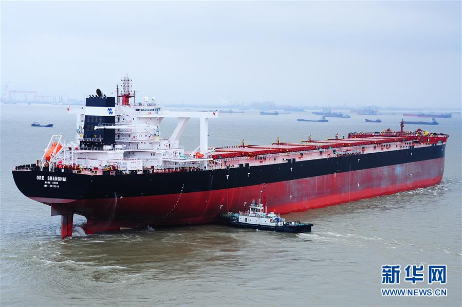 12月10日,在江苏省太仓港扬子江海工码头,40万吨级“ORE SHANGHAI”矿砂船由太仓引航站引领至上海宝山交接出江,驶向大洋,该船长361.9米,宽65米,高30.4米,满载时达40万吨,这是该系列交付使用的第5艘40万吨级矿砂船。 新华社发(计海新 摄)