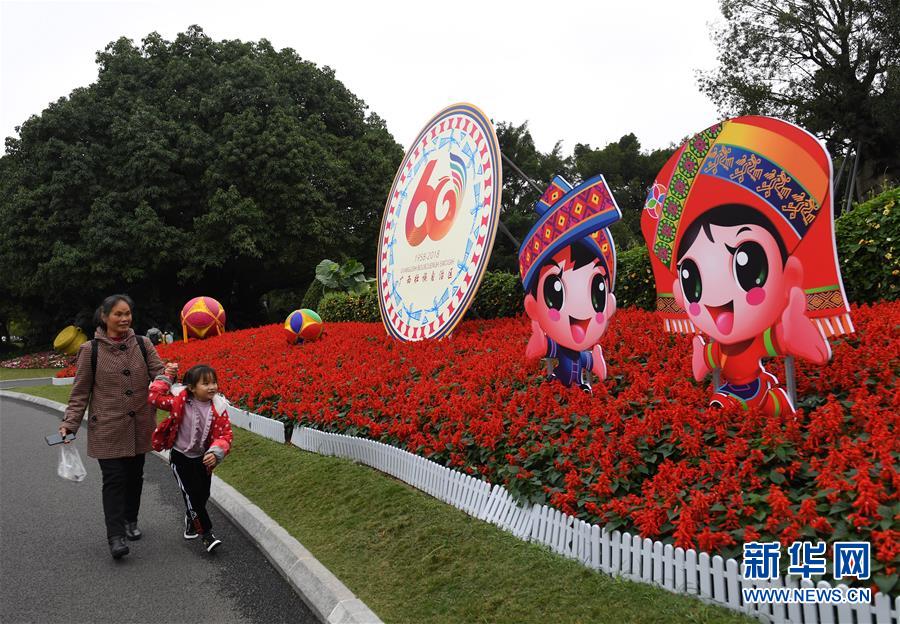 12月10日,在广西南宁名树博览园,市民从欢庆自治区成立60周年花坛边走过。 当日,广西壮族自治区成立60周年庆祝大会在南宁举行。 新华社记者 陆波岸 摄