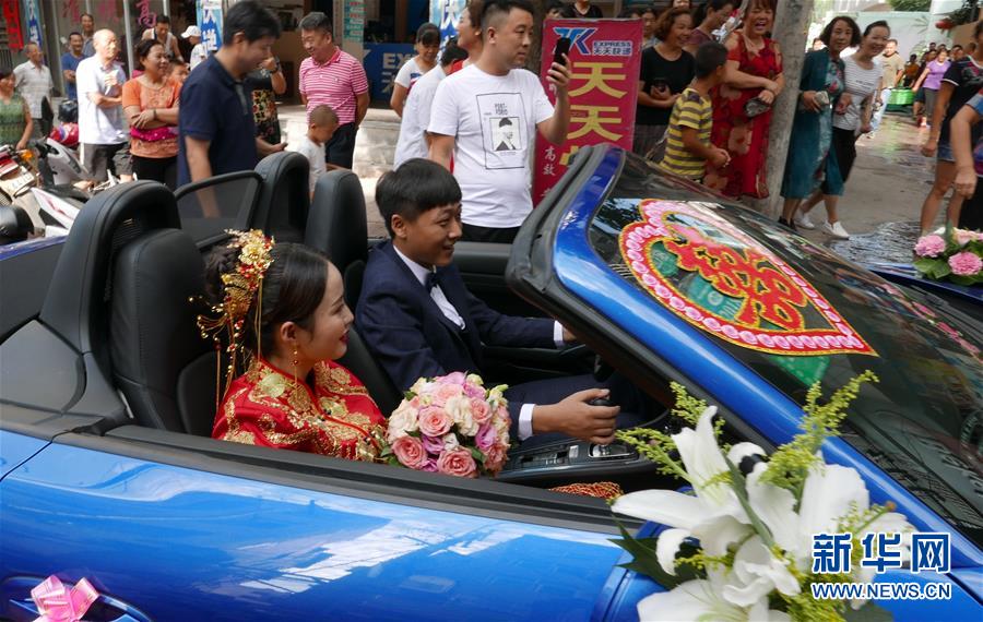 商洛市丹凤县龙驹寨镇新人尚琪琪与叶嘉欣成婚,漂亮的婚车开进农家(2018年8月18日摄)。 新华社发(方立 摄)