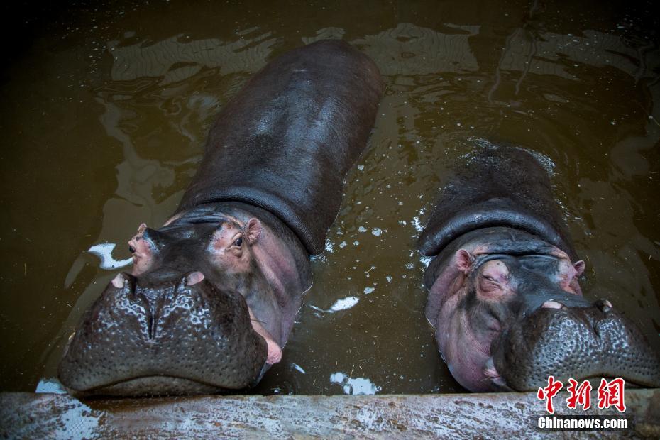12月10日,武汉气温持续下降,武汉动物园中的动物们也进入越冬状态。武汉动物园已做好准备应对寒冬,并根据动物们不同的生活习性,使用浴霸、电油汀、红外线保温灯等保暖用品帮助动物们安然过冬。图为河马在水温达18摄氏度以上的水池里悠然自得地享受“温泉”。中新社记者 张畅 摄